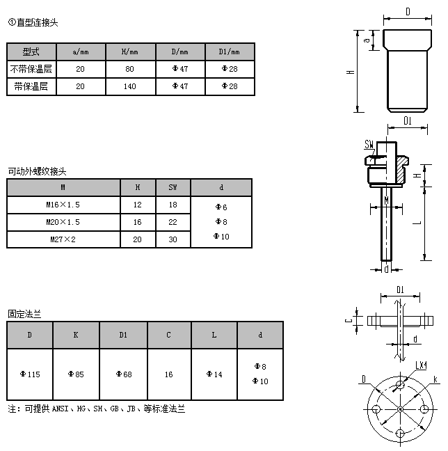 雙金屬溫度計有多種安裝固定型式滿足用戶需求,主要安裝形式包括:可動外螺紋、固定法蘭等。