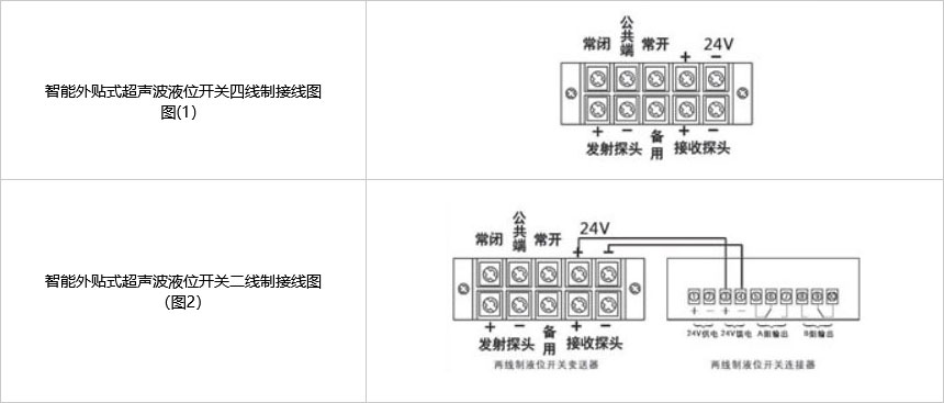選擇安裝位置、清理罐璧油漆污垢、將專用的粘接劑少許涂抹在安裝底座、按照預定的位置安裝底座。待底座安裝完畢后,風干后將探頭傳感器涂抹耦合劑安裝于底座上。將兩個探頭傳感器的連接線通過防爆軟管和鍍鋅管接入液位開關變送器中,按照接線端示意圖接線。